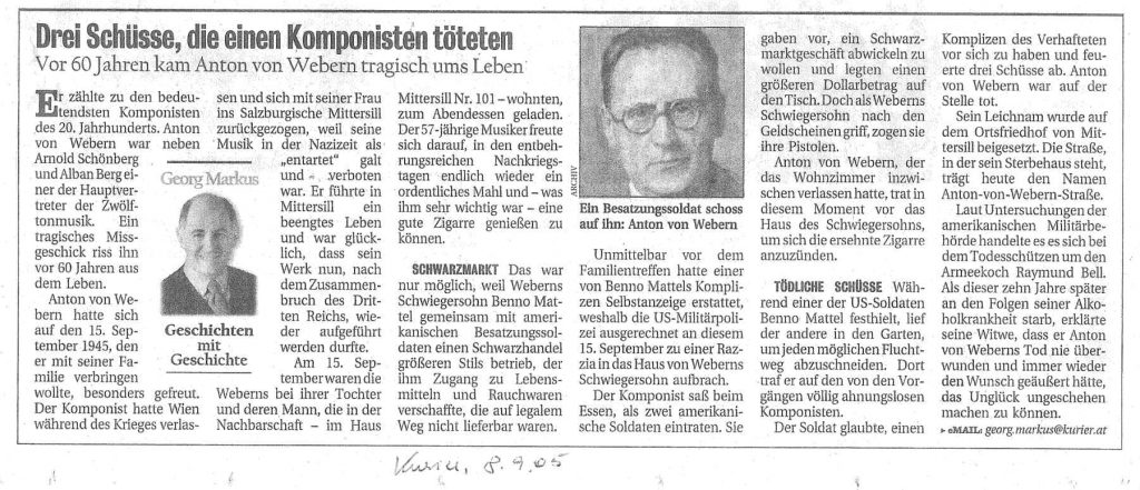 Zeitungsartikel zu Weberns Tod 0Vollständige Größe 1800 × 775 Pixel Anton von Webern Vorheriges Bild Schreibe einen Kommentar Antwort abbrechenDu musst angemeldet sein, um einen Kommentar abzugeben.
