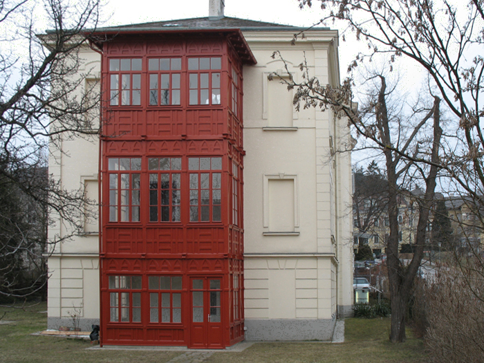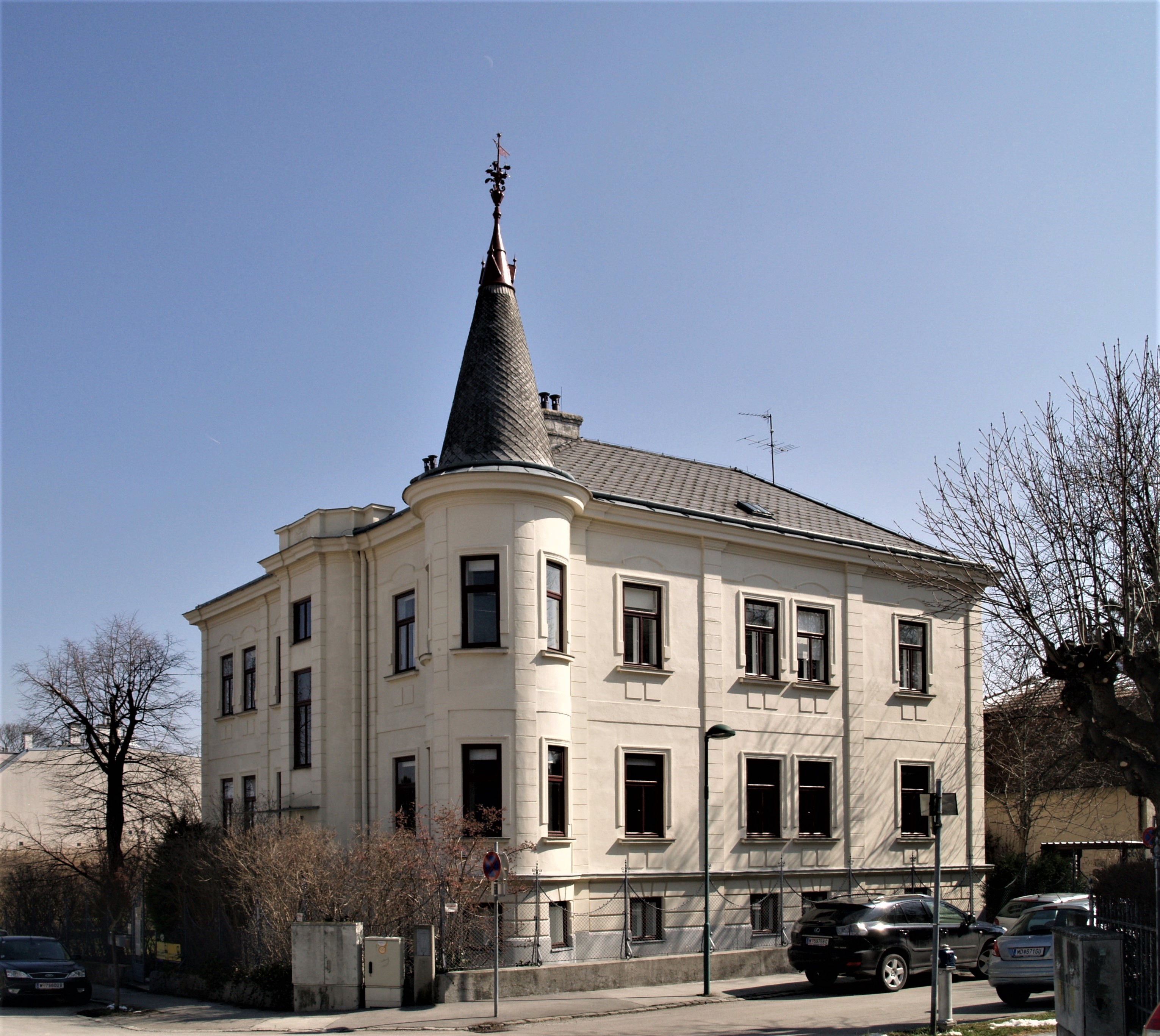 1905 von Stadtbaumeister Martin Breyer erbautes, 2-geschossiges Eckwohnhaus mit späthistoristischer Fassade, Eckturm und gartenseitiger Holzveranda.