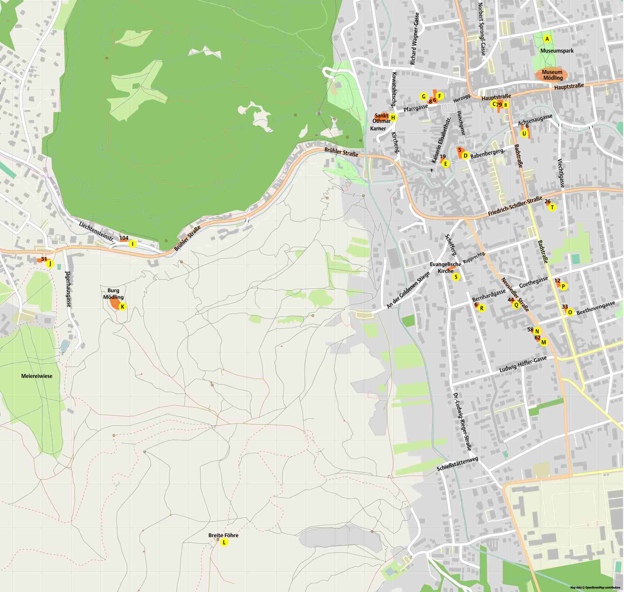 Zur Orientierung dient ein Stadtplan von Mödling mit einem Verzeichnis all der Orte, die wir besuchen werden.