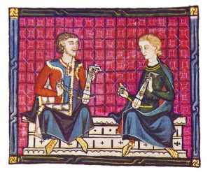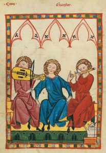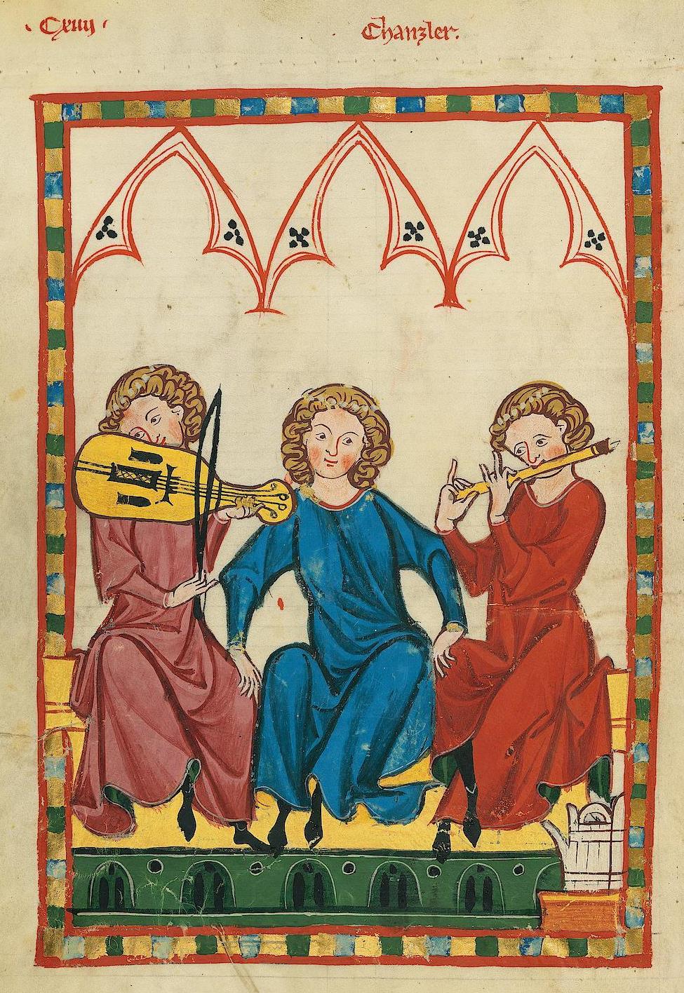 Musiker mit Fidel und Traversflöte, „Der Kanzler“, Codex Manesse, 14. Jahrhundert.