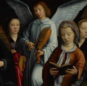 Engel mit Rebec, Ausschnitt aus „La Vierge entre les Vierges“, Gérard David (1450-1523).