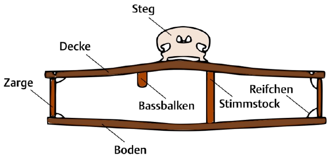 Der Korpus der Violine besteht aus Zargen (Seitenteile in der typischen Geigenform), Boden, Hals und Decke. Zargen, Boden und Hals werden meist aus langsam gewachsenem Ahorn hergestellt, die Decke aus fein­ädriger Fichte. Griffbrett, Saitenhalter und Wirbel sind aus hartem Holz, meist Eben­holz, der Steg ist aus Ahorn. Boden und Decke sind gewölbt. In die Decke sind f-förmige Schall­löcher eingeschnitten. Die sichere Verbindung der einzelnen Teile wird durch innen an den Zargen entlanglaufende „Reifchen“ hergestellt. Im Inneren der Violine befindet sich der sog. Bassbalken längs unter der tiefsten Saite sowie der Stimmstock, senkrecht stehend unter dem Fuß des Steges auf der Seite der höchsten Saite; beide haben die Aufgabe, die Schwingungen, die vom Steg auf die Decke übertragen werden, in den übrigen Korpus weiterzuleiten, wo sie zum charakteristischen Geigenton verstärkt werden.