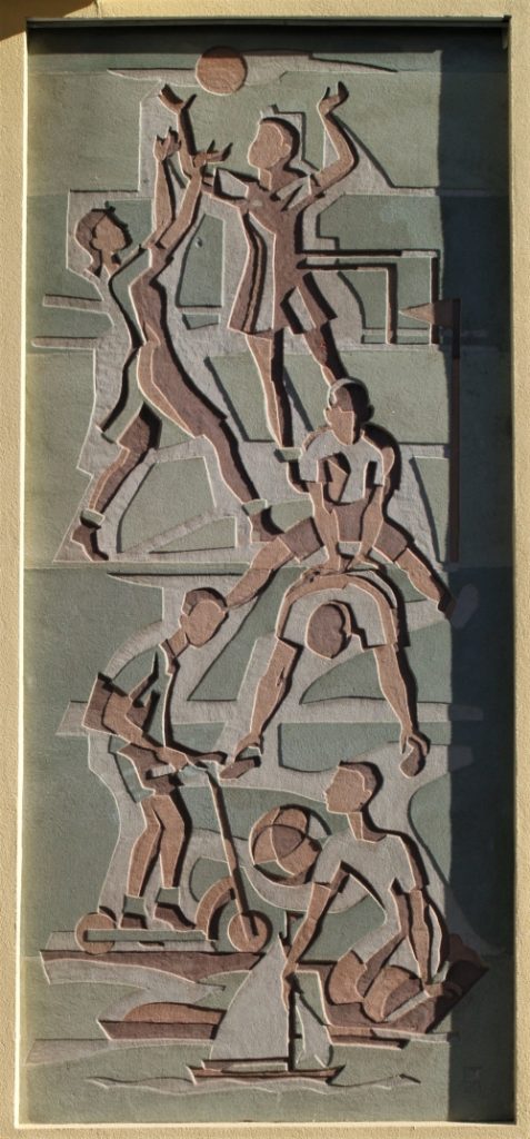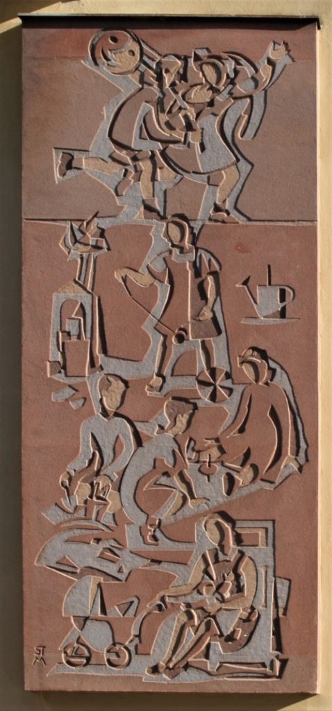 Jakob Thomastraße 28, Wohnhausanlage der Gemeinde Mödling, errichtet in den Jahren 1951-1953, Sgraffito, signiert STM, Künstler unbekannt