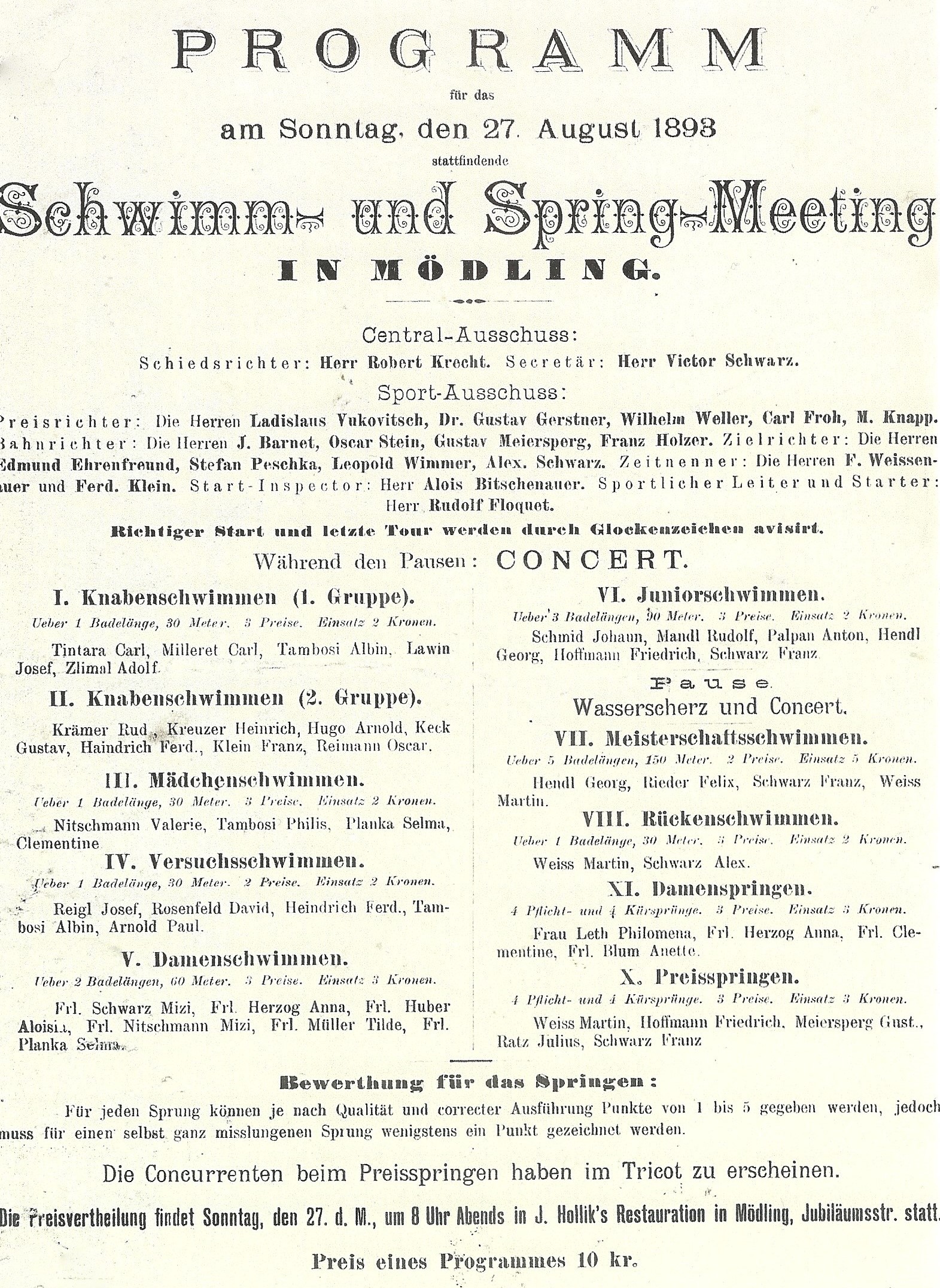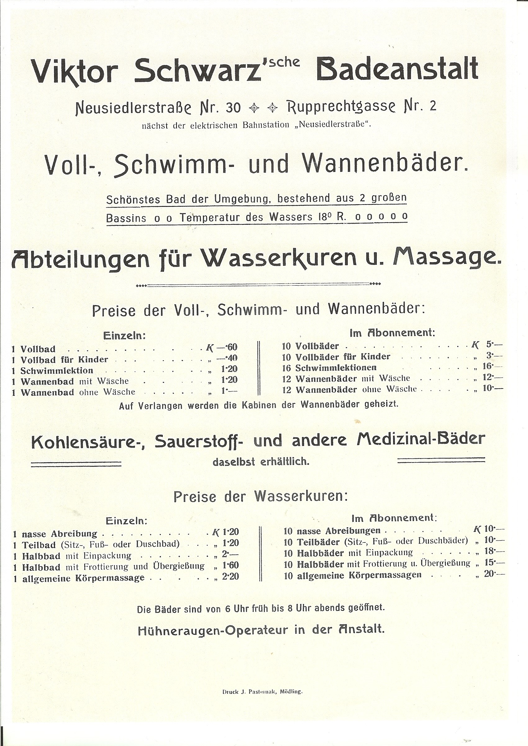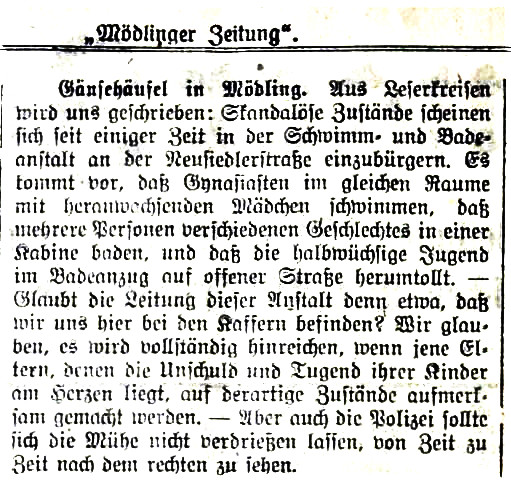 Ohne öffentliche Wasserleitung in der Neusiedlerstraße ist die Wasserversorgung von Beginn an problematisch. Das Wasser wird mittels Schläuchen von der evangelischen Kirche her geleitet – ein unhaltbarer Zustand. Um 1900 wird diesem Missstand durch eine Tiefenbohrung auf mehr als 20 m Tiefe auf dem Grundstück Jubiläumsstraße 7 (heute Dr. Ludwig Riegerstraße) und Verlegung einer 80 m langen Leitung ein Ende gesetzt: Ein modernes „Wellness-Center“ ist entstanden mit Schwimmfesten und Wettschwimmen.