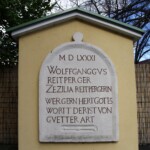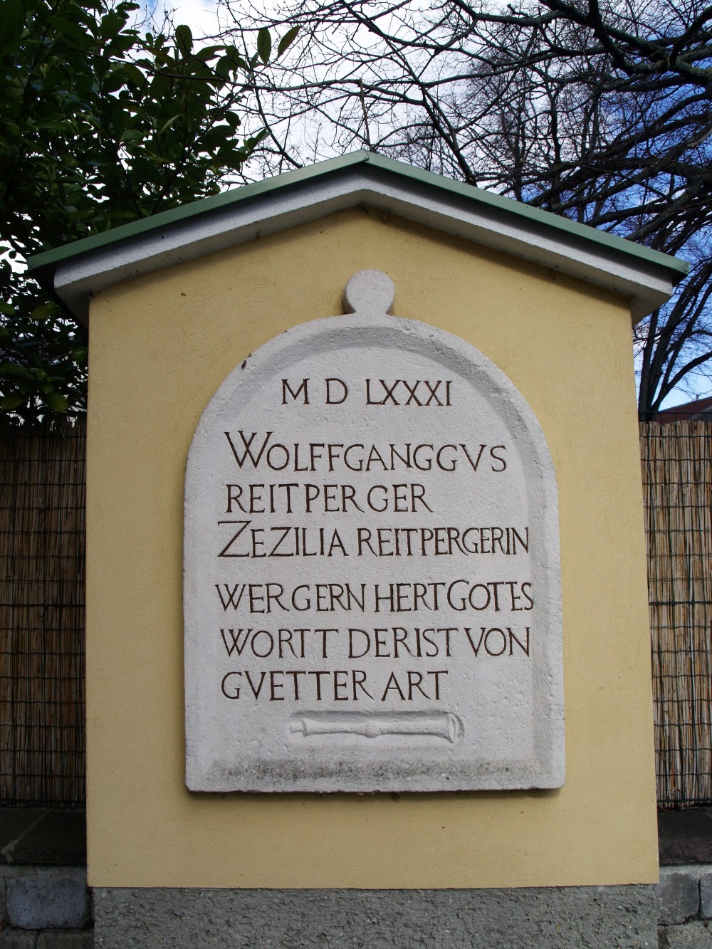 1581 „Protestantenstein“, Steintafel von einer zerstörten Wegkapelle zwischen Mödling und Gumpoldskirchen, heute rechts neben der evangelischen Pfarrkirche aufgestellt: