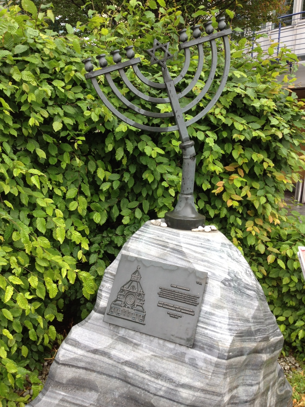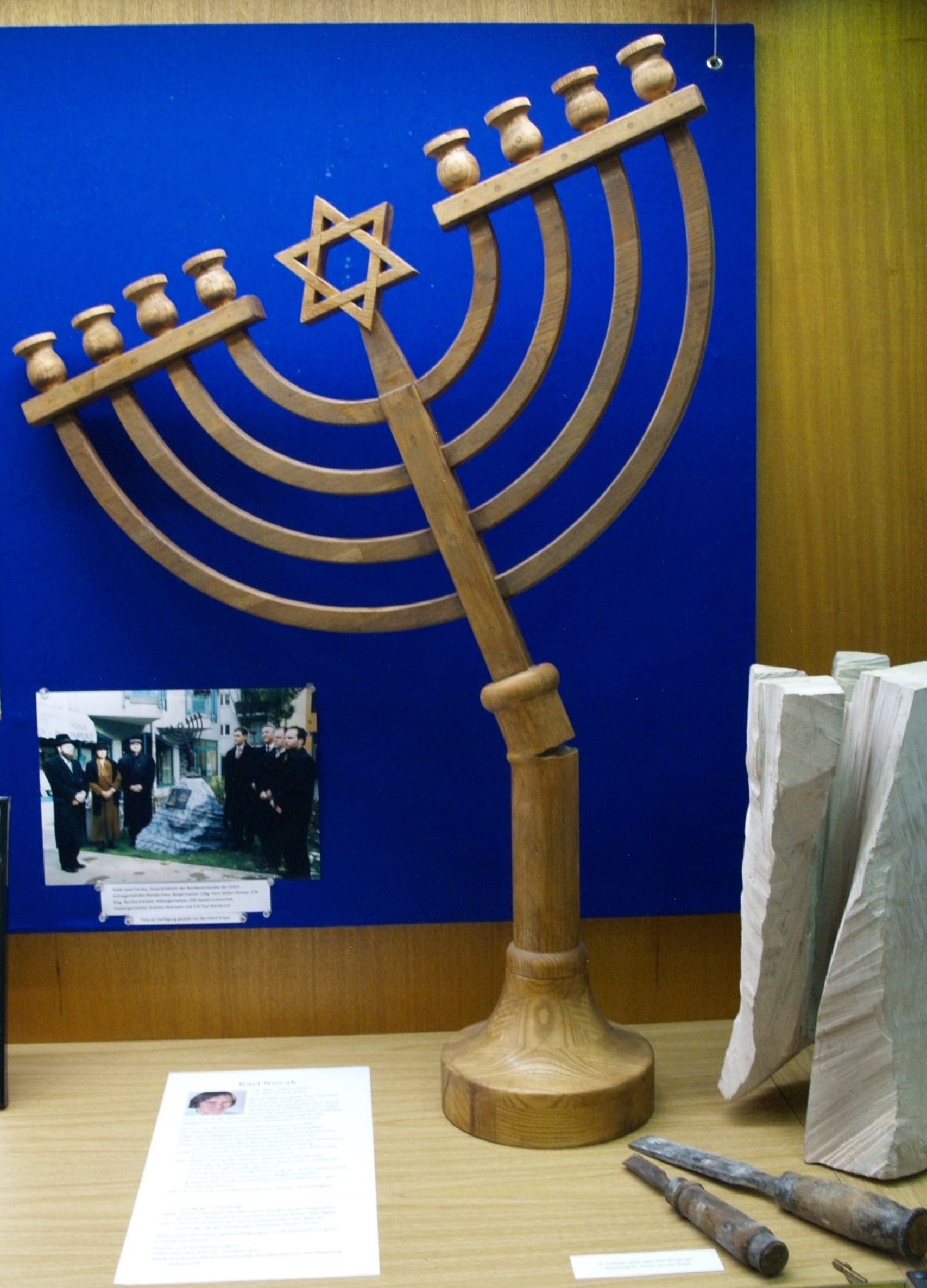20. Oktober 2003 Enthüllung des Mahnmals für die ehemalige Synagoge: ein geknickter Chanukka-Leuchter auf einer Basis aus Wachauer Marmor mit einer Gedenktafel. Entwurf: Karl Novak, Mitglied des Mödlinger Künstlerbundes