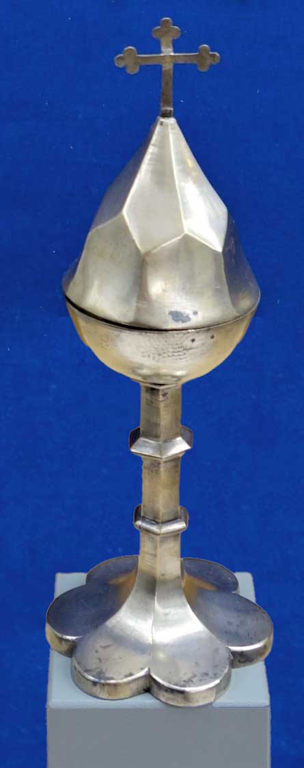 Pyxis ist ein Gefäß zur Aufbewahrung geweihter Hostien, z.B. für den Gang des Priesters zur Spendung der Sakramente an Kranke, besonders an Sterbende (Versehgang).