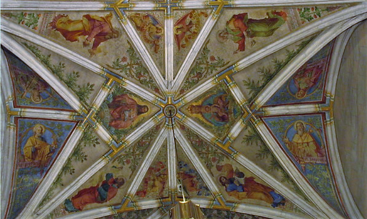 - Deckenfresken von den Brüdern Franz (1840–1890) und Karl (1835–1907) Jobst. Sie stehen in der Übergangsphase vom Historismus zum Jugendstil. Ihre Wandmalereien finden sich in zahlreichen Kirchen und Schlössern der Monarchie: u.a. Votivkirche/Wien, Dom/Esztergom, Universität/Czernowitz.