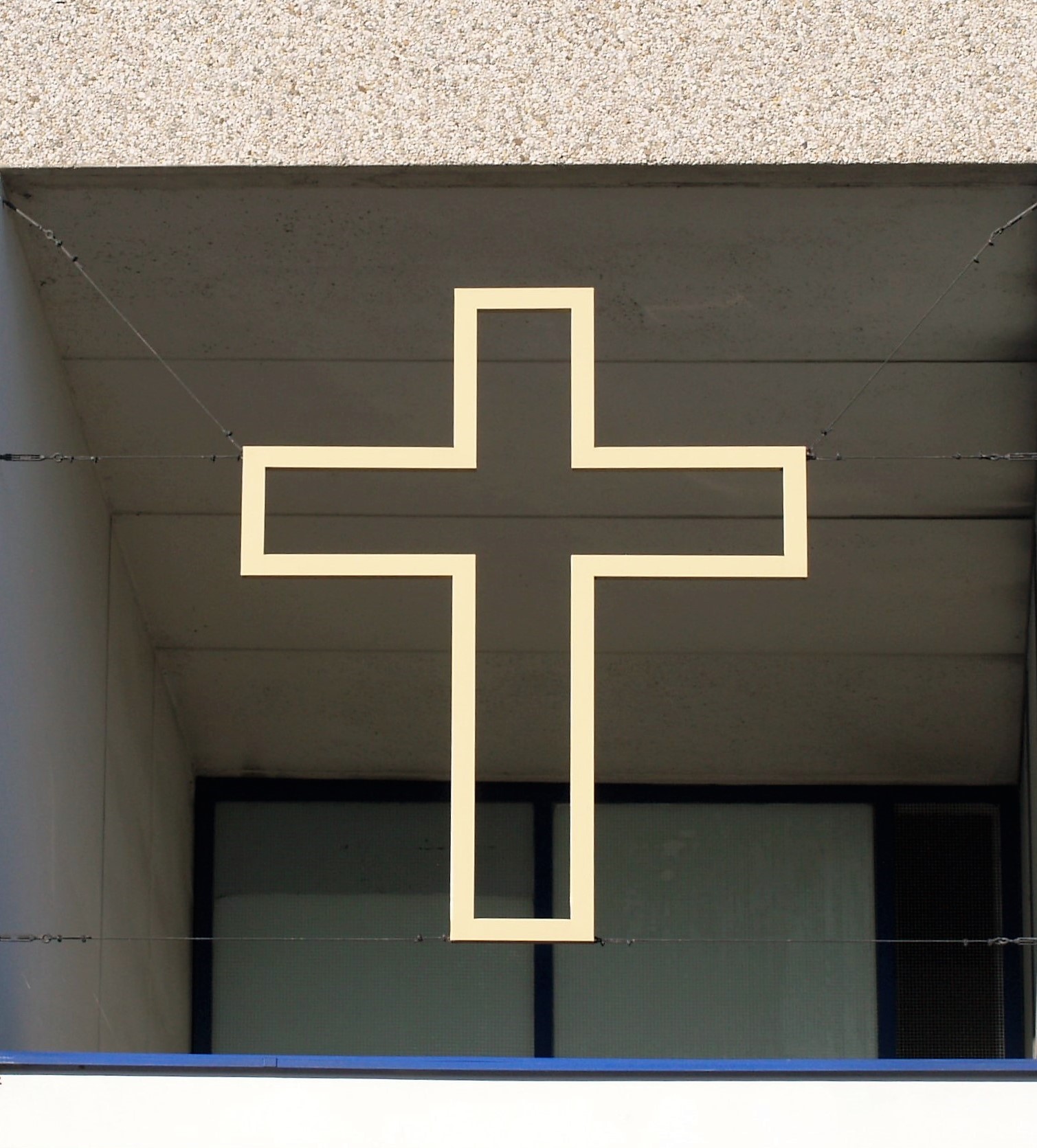 2015 Anbringung des „Auferstehungskreuzes“ (Entwurf Wolfgang Wess) anlässlich der 40-Jahr-Feier von St. Michael
