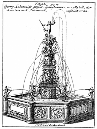Im folgenden Jahr traf es sich, dass der berühmte Astronom Tycho Brahe sich am Hof seines Förderers und Astronomen-Kollegen, des Landgrafen Wilhelm IV., in Kassel aufhielt und dort Werke (wohl auch Springbrunnen) des Nürnberger Bronzegießers Georg Labenwolf kennenlernte, die ihn stark beeindruckten. Nach seiner Rückkehr nach Dänemark berichtete er König Frederik davon; dieser fand, dass ein Springbrunnen aus Labenwolfs Werkstatt sich im Schloss Kronborg sicherlich gut machen würde, und bestellte 1576 eine solche „Wasserkunst“. Labenwolf weilte im Winter 1576/77 in Dänemark, bei dieser Gelegenheit dürfte ein Vertrag zustande gekommen sein.